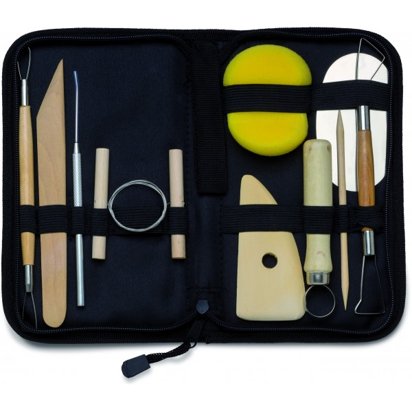 Töpfer Tool Set 11tlg. De set in een zwarte nylon behuizing bestaat uit: 1 bossier schijf, draadlinnen, metalen spatel, metalen gravure naald, houten spatel, modellering van hout en spons, evenals 3 modelleringslussen (mirettes).