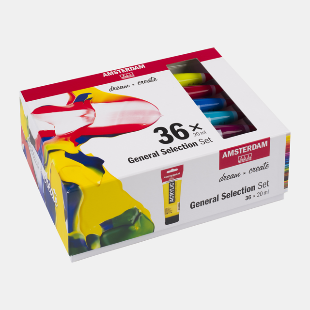 Amsterdam standaard acrylverf – set 36 x 20ml general bestaat uit 36 van de 90 kleuren uit het Talens Amsterdam assortiment: