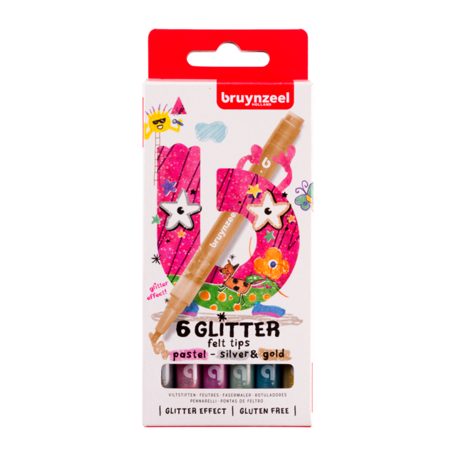 Deze Bruynzeel viltstiften zijn perfect voor het creëren van prachtige glittereffecten! Schud ze voor gebruik en druk eenmaal op de punt, dan ben je klaar om je creativiteit de vrije loop te laten! Deze set bevat mooie zachte pastelkleuren en goud & zilver. Geschikt voor kinderen vanaf 5 jaar. Kenmerken: Goede kleurweergave – Mooi op wit en zwart papier.