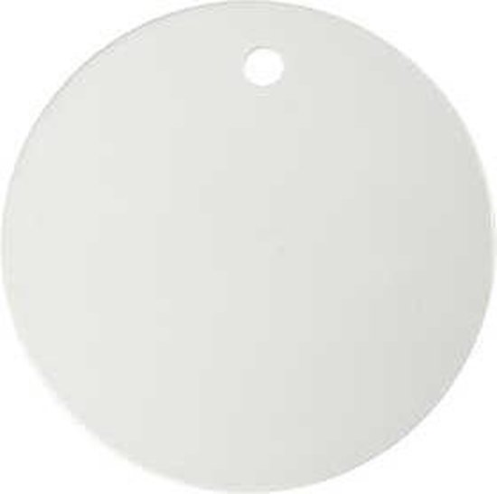 Rond bord gemaakt van keramiek met een groot rond gat voor het bevestigen een een koord. De voorkant is geglazuurd