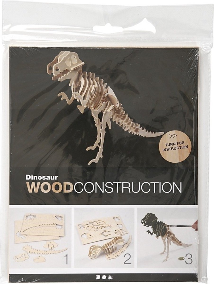 3D puzzel van licht hout om zelf in elkaar te zetten in de vorm van een dinosaurus. Inclusief instructie
