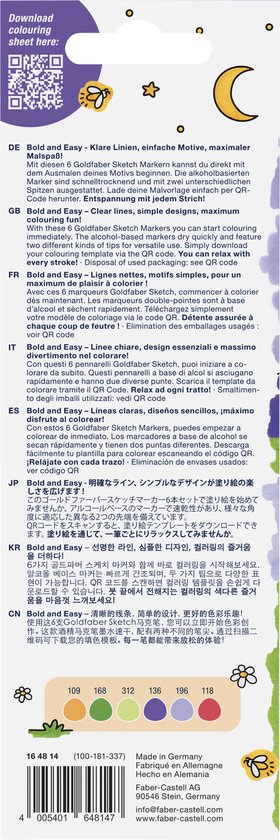 Deze creatieve set Bold Easy bevat 6 Goldfaber sketchmarkers op alcoholbasis met sneldrogende inkt en twee verschillende penpunten (fineliner met metalen behuizing 0.6 mm en penseelpunt) die zorgen voor een geweldige kleurrvaring. De inkt is veegvast, waterbestendig en droogt snel. De doppen en de houders van de sketchmarkers zijn gemaakt van 100% gerecycled materiaal en kunnen kleurvariaties vertonen door de productie. Via de QR-code op de verpakking kun je een kleurplaten downloaden die moeiteloos gemakkelijk in te kleuren zijn. Inhoud set World of Frogs: kleurnummers