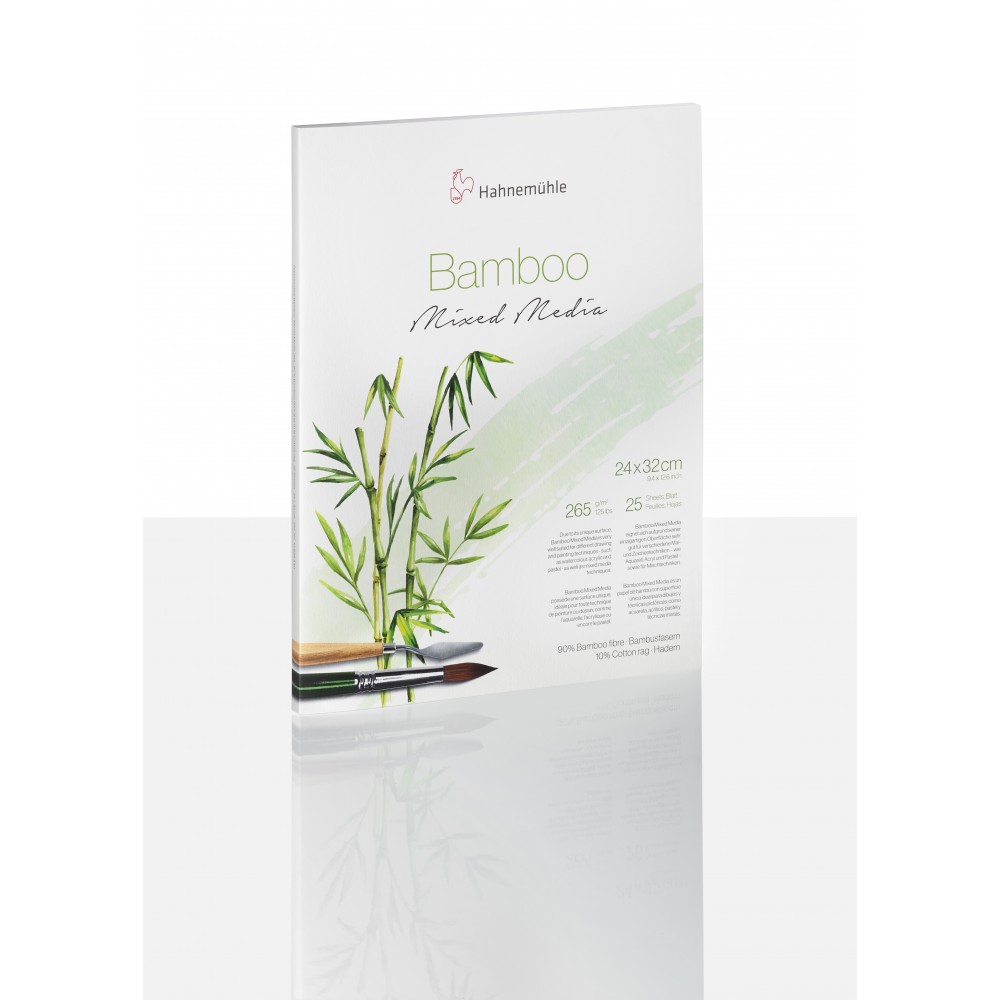 De Bamboo mixed media serie is gemaakt van bamboo vezels. Bamboo is zeer snelgroeiend plant, waardoor het een vezel is die makkelijk en snel te fabriceren is. Dit mixed media papier heeft een off-white kleur en door het unieke oppervlak geschikt voor zeer diverse teken en schilder technieken. Je kan onder meer aquarelverf, acrylverf, gouache, maar ook potlood, houtskool en pastel gebruiken. De oppervlakte structuur is redelijk te vergelijken met de Torchon blokken van Hahnemuhle. Het papier vloeit fantastisch wat de helderheid van de kleur zeer versterkt. Het papier is zuurvrij en heeft een lange levensduur