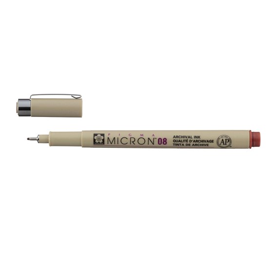 Pigma Micron-pennen zijn watervaste, permanente fineliners. De Pigma Micron 08 van Sakura zijn verkrijgbaar in 4 verschillende kleuren met een dikte van 0,5mm